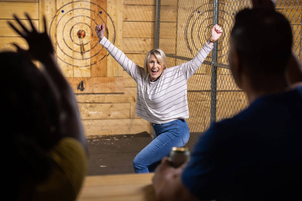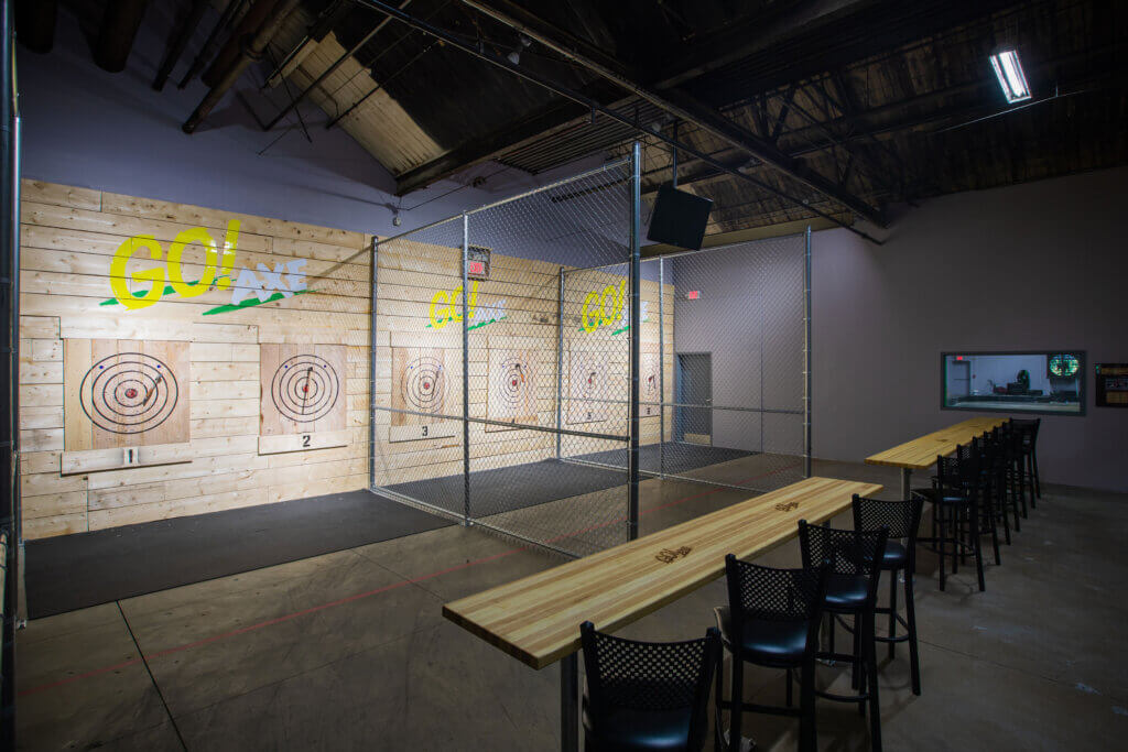 What sets this experience apart is the gameplay. Choose from 10 digitally projected games displayed directly on custom end grain wood targets. Options range from Connect Four and Tic Tac Toe to Zombie Hunt. The end grain boards are designed to make axes stick more easily and give each throw a clean, satisfying feel. It’s part competition, part hangout, and all adrenaline.